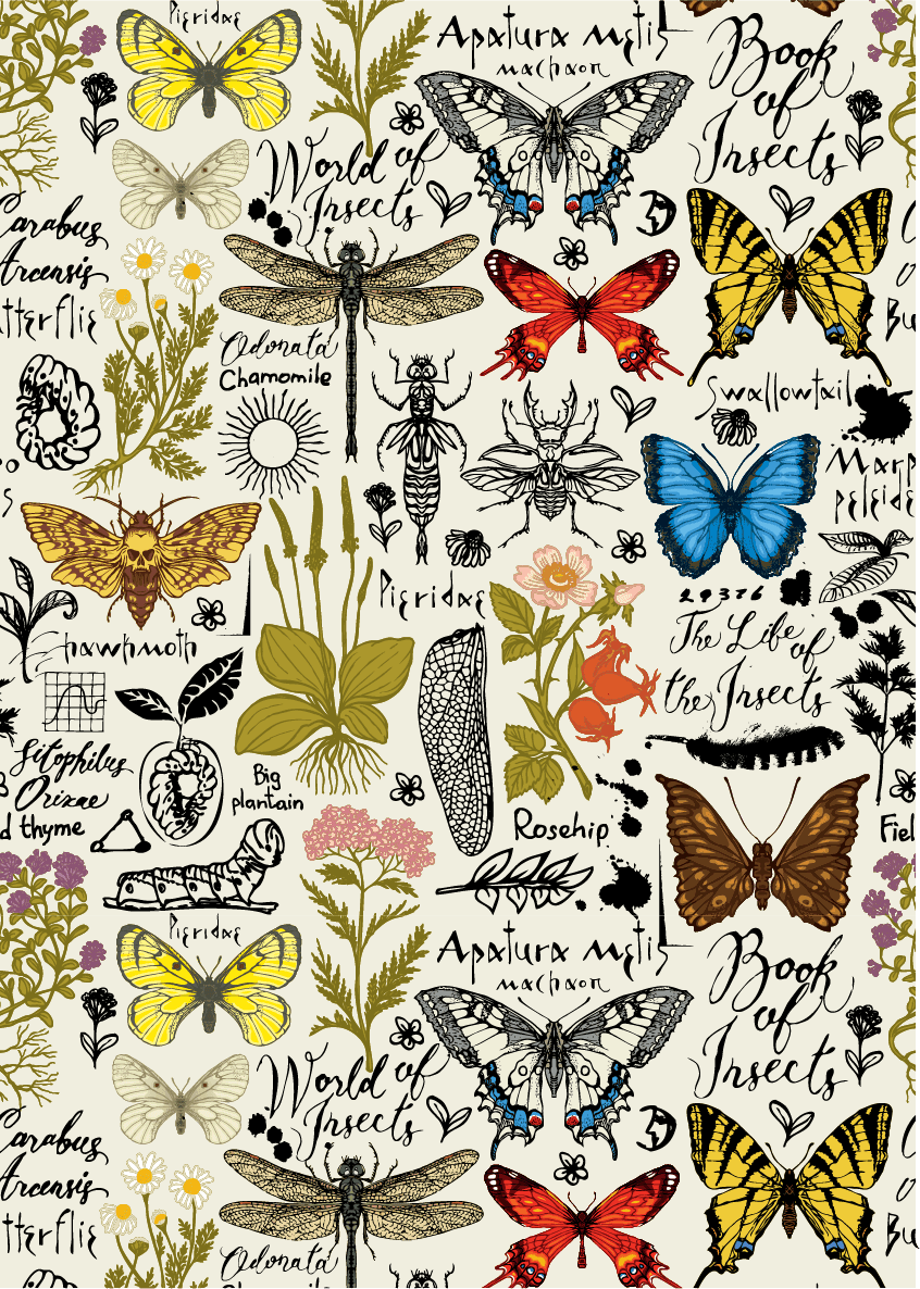 For lovers of the natural sciences, this design offers a collection of detailed illustrations of insects reminiscent of old entomology books. The precise depictions of beetles, butterflies and dragonflies add a fascinating and educational dimension.