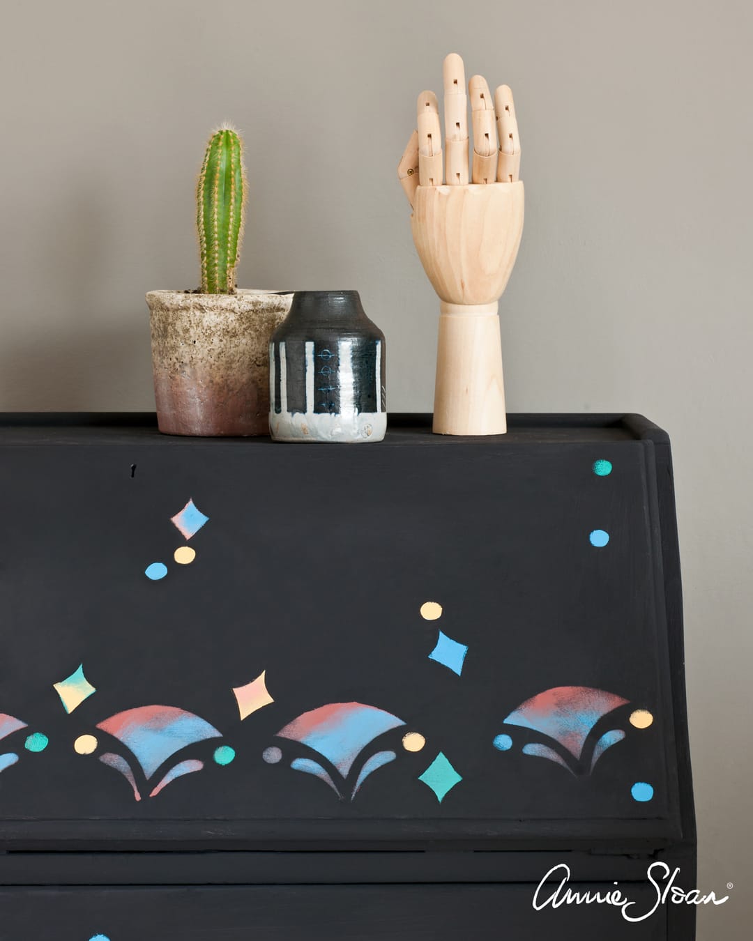 Inspiriert von antiken griechischen Keramiken verleiht diese Kreidefarbe Möbeln eine starke, grafische Präsenz.